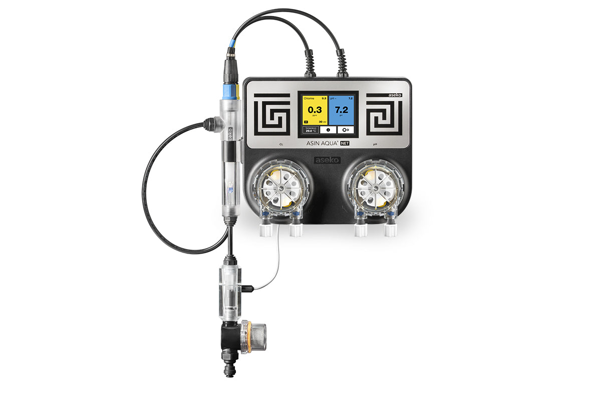 Kompakt doseringsenhet för automatisk behandling av poolvatten med internetuppkoppling. .