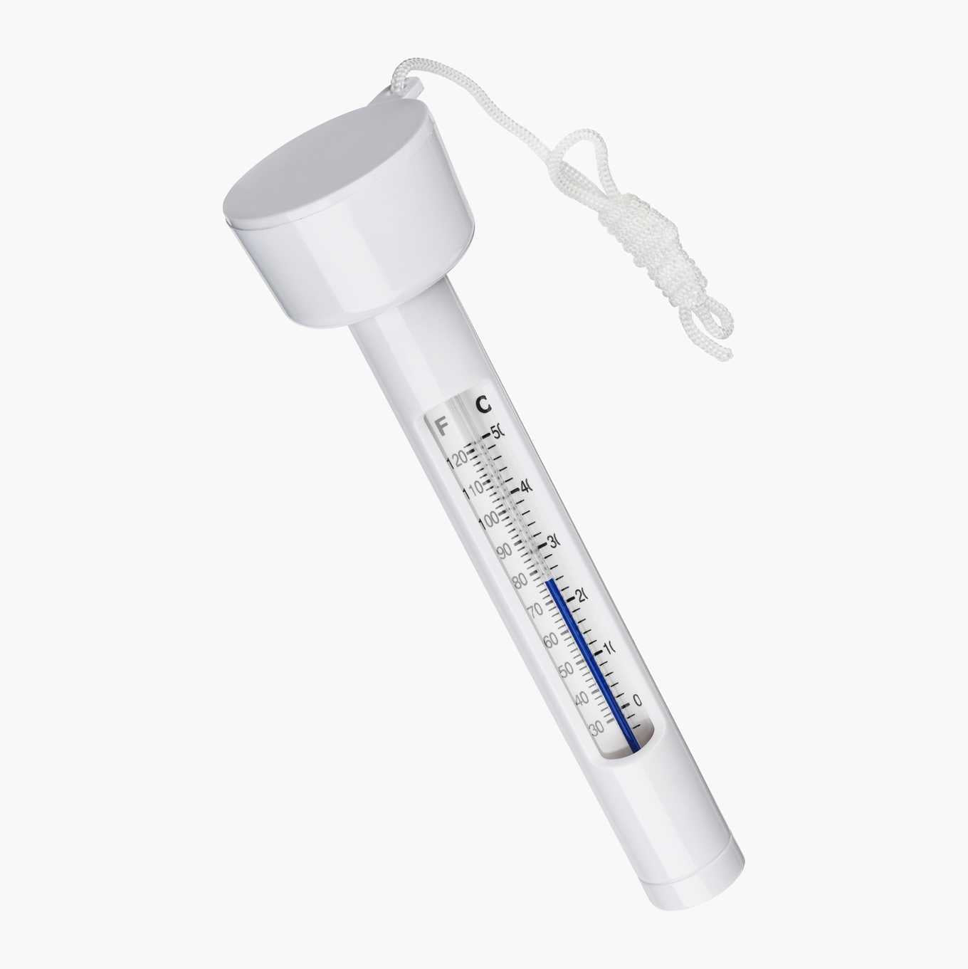 Termometer med bojring som gör att den flyter. Med snöre så att den även kan knytas fast. Innehåller inget kvicksilver.