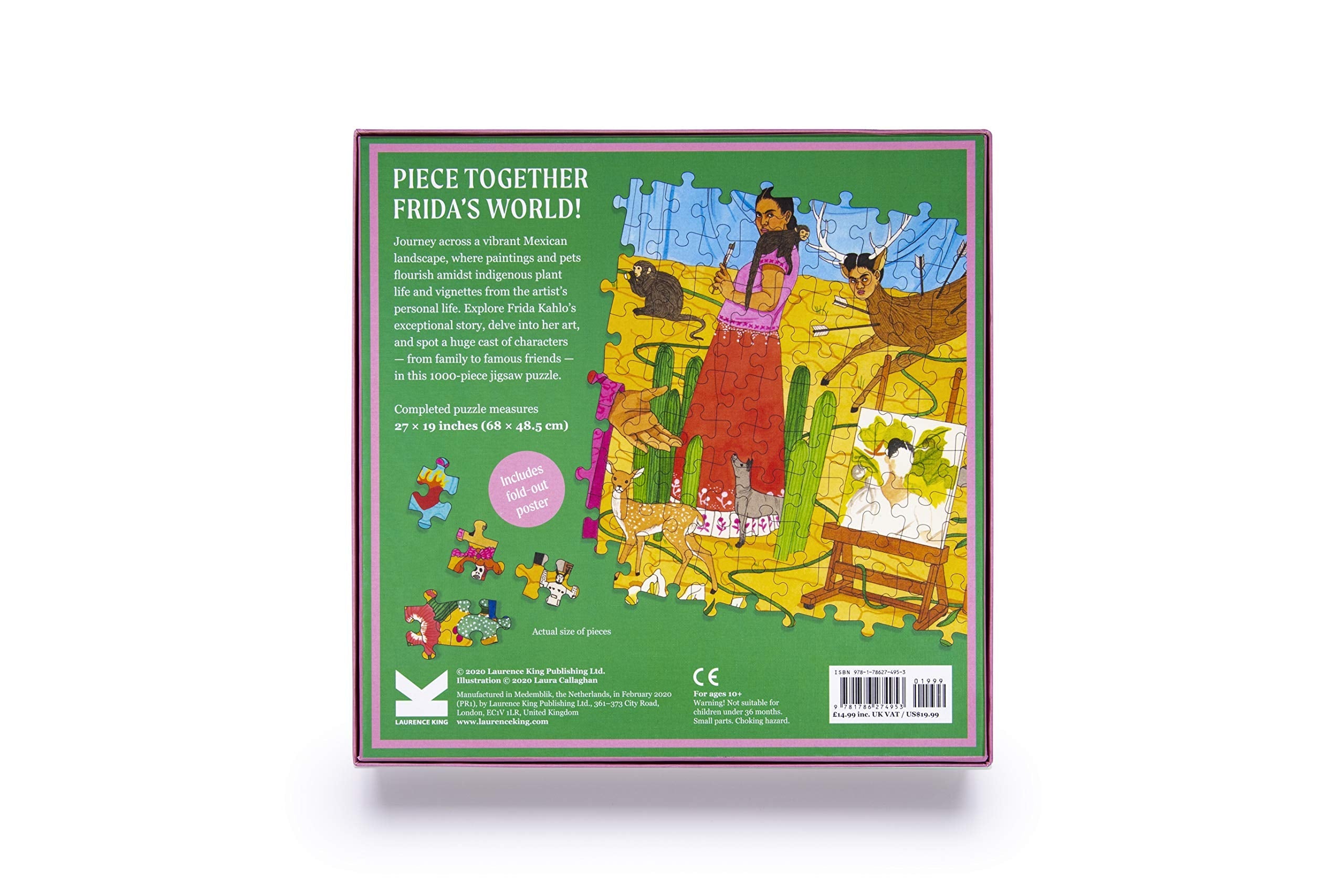 Frida själv tar mittplatsen, omgiven av ikoniska element från hennes liv. Invävt i den livliga mexikanska scenen finns en stor mängd samtida statister, från Kahlos familj och berömda vänner till hennes olika exotiska husdjur. Den som är uppmärksam kommer också att upptäcka många referenser till hennes konst samt de tragedier och triumfer som präglade hennes karriär. För dem som just upptäcker Kahlo vägleder den medföljande planschen pusselläggaren genom resan med fakta om de 25 referenser som finns i pusslet.